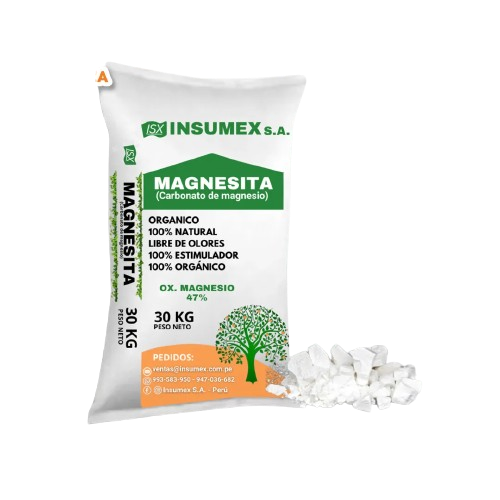 Se presenta como un polvo blanco a crema que se descompone a partir de 350°C, es soluble en ácidos presentando efervescencia, ligeramente soluble en agua, insoluble en alcohol. La Magnesita MG-5 es constituyente central de la molécula de clorofila, sin clorofila no hay fotosíntesis y sin fotosíntesis no hay producción agrícola, estimula la absorción del fosforo, las plantas deficientes de este elementopresentan un color amarillento en las hojas.